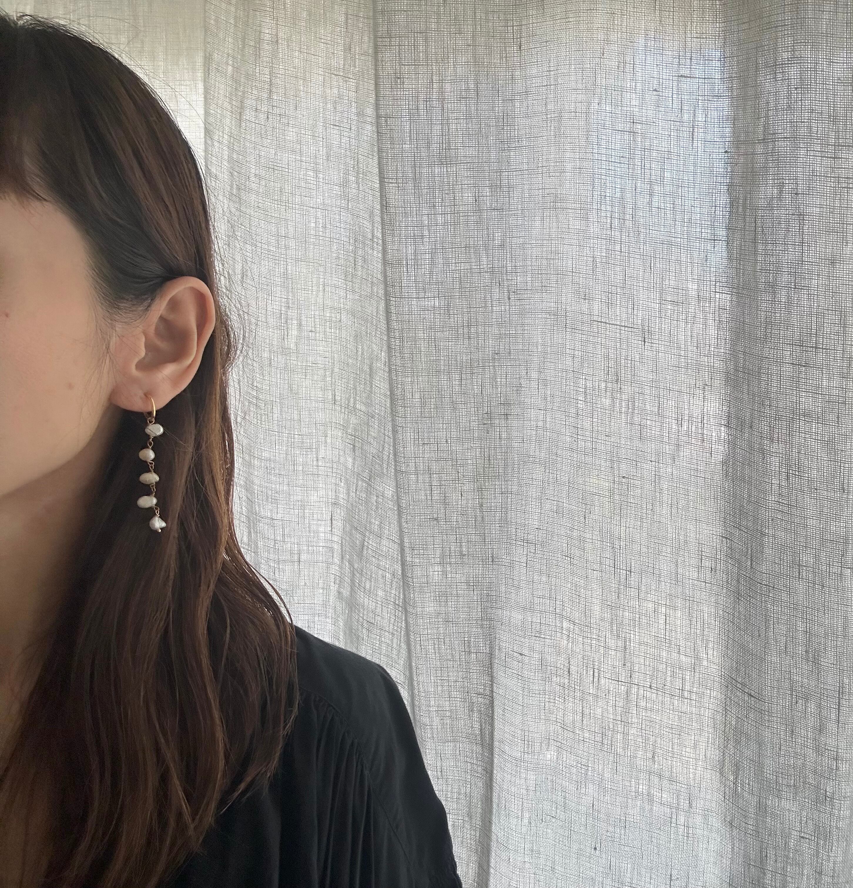 日常だけでなく、フォーマルシーンでも活躍してくれるパール。耳元で上品に揺れるロングピアスを作りたかったので敢えて小さめで可愛らしい淡水パールを選びました。